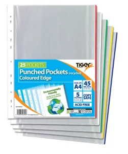 A4 Recycled Punched Pockets with Coloured Edges 25’s